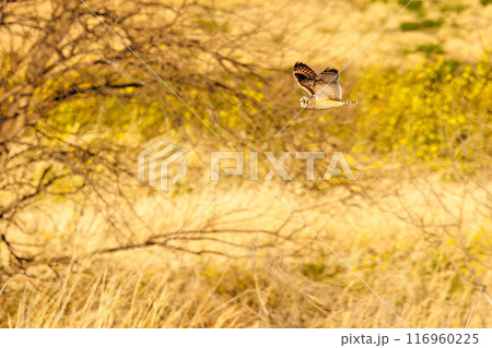 夕暮れの菜の花畑と麦畑の上を飛翔する美しいコミミズク(フクロウ科)。埼玉県鴻巣市市荒川河川敷