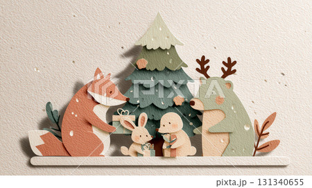 クリスマスツリーの前でプレゼントを渡す動物