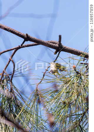 松の木で餌を探して飛び回る日本最小の鳥可愛いキクイタダキ(ウグイス科)江戸川区葛西臨海公園2023