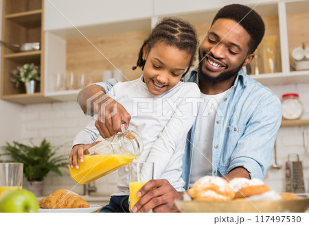 Time for vitamin C. Cute little african girl pouring fresh orange juice for her smiling daddy, spending time together at kitchen, copy space