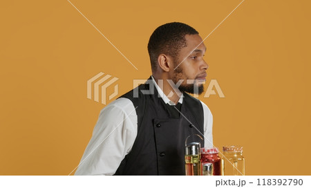 Waiter bringing drinks in glasses on a tray for clients at a table, serving lemonade to customers before their dinner. Professional staff serving people at a five star restaurant. Camera A.
