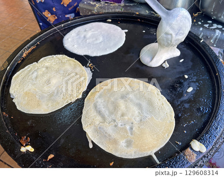 在傳統早餐店拍攝廚師用勺子將麵糊倒入煎檯上製作粉漿蛋餅