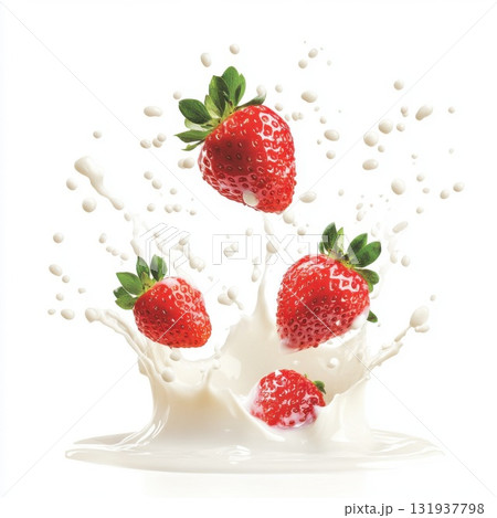 Fresh strawberries splash into creamy milk creating a delightful burst of flavor and texture