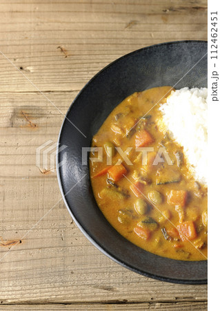 豚肉、かぼちゃ、人参などの野菜が沢山入った熱々カレーライスを白背景で俯瞰撮影