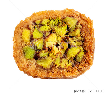 top view of mabrume baklava with pistachio cutout