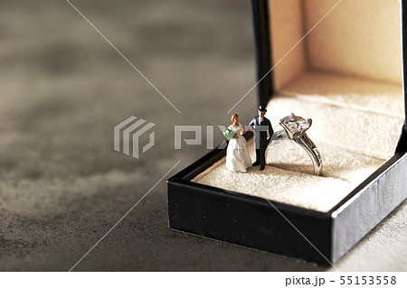 ダイヤモンドの婚約指輪と新郎新婦のミニチュアフィギュア 結婚イメージ