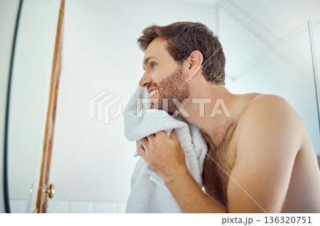 Man, cleaning face and towel in mirror with smile, self care and hygiene to start morning in home bathroom. Young guy, person and cloth for beauty, facial cosmetics and wellness for beard in house