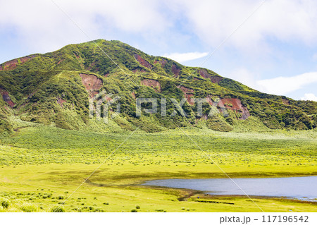新緑とピンクのミヤマキリシマに覆われた阿蘇山の散歩道