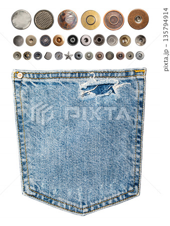 Denim pocket with torn fabric and metal rivets