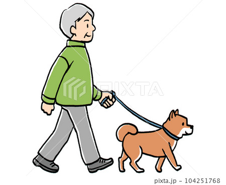 楽しそうに柴犬の散歩をするシニア男性の手書き風イラスト