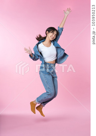 Young Asian woman raises her arm and jumping in a studio shot, expressing happiness and success isolated pink background