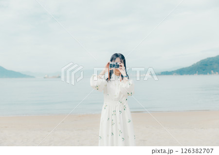 青空と海に囲まれた、透明感あふれる女性ポートレート