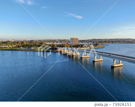 Aerial view of Mission Bay in San Diego, with Ingraham Street bridge during summer sunny day.