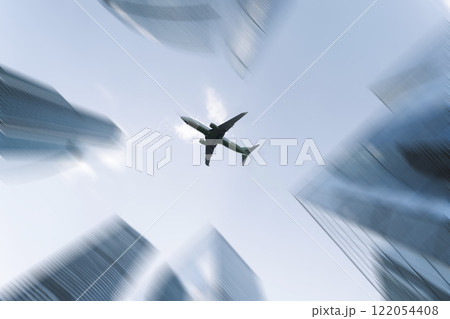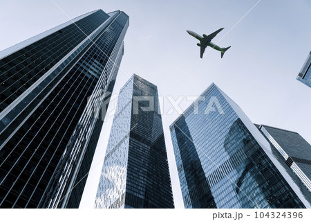 Airplane flying on business skyscrapers of financial center. Travel, economy, cargo, transportation concept