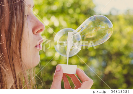 Beautiful and young girl blows soap bubbles