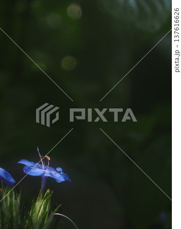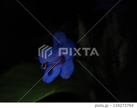 1月の植物館にてマクロ撮影、ルリハナガサの鮮やかな青い花びらと雄しべの先に留まる美しい一滴の水滴