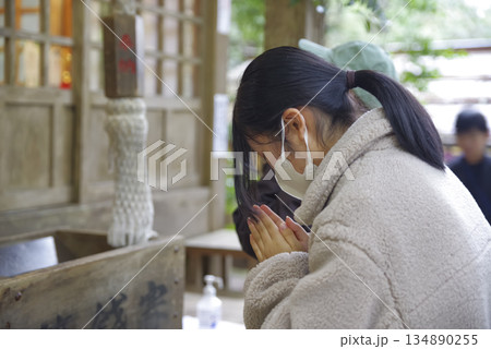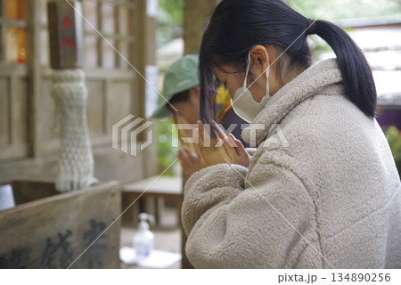 An attractive Asian female tourist is putting her hands together in a prayer position in a temple.