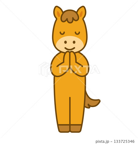 手を合わせて祈る馬のシンプルイラスト起立ver(干支・お正月・初詣)