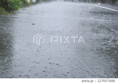 大雨で道路の水たまりに打つつける雨の水紋