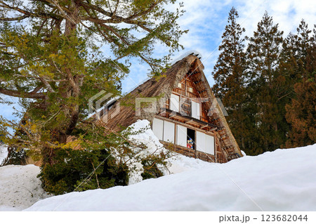 雪の積もった合掌造りと大木