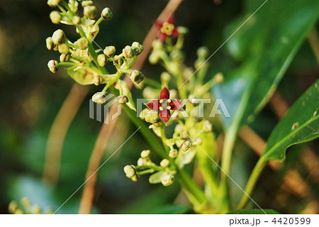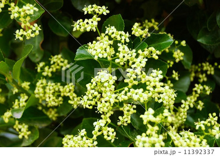 色鮮やかなアオキの若葉と花(班入りアオキ)