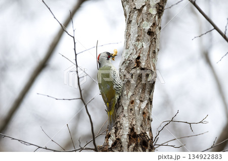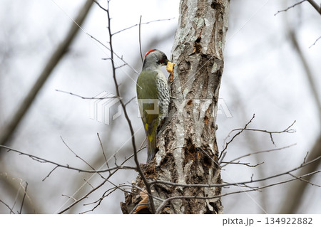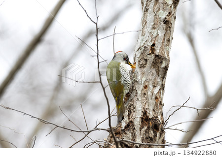 冬の朝 落葉広葉樹の巨木とアオゲラ(キツツキ、啄木鳥)高精細