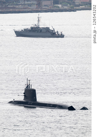 呉湾に浮かぶ たいげい型潜水艦と航行中の掃海艇あおしま