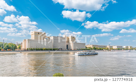 View of the Ministry of Defence of Russian Federation, and Moscow river embakment with cruise ships at sunset.
