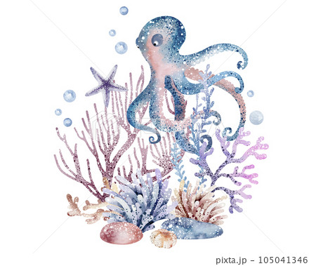 Watercolor illustration underwater marine animals octopus, stingray, jellyfish. Marine inhabitants of the underwater world. illustration, education, postcard, sticker, sublimation.