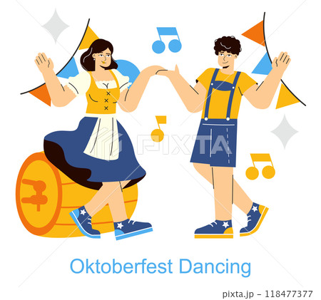 Oktoberfest concept. A joyful couple in traditional Bavarian attire dancing with festive decorations, symbolizing the celebratory spirit of the event. Vector illustration.