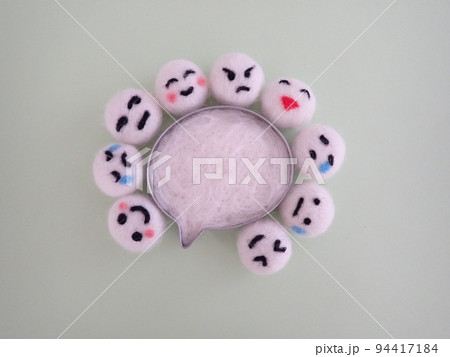 吹き出しの周囲に色々な表情をしている顔、羊毛フェルト