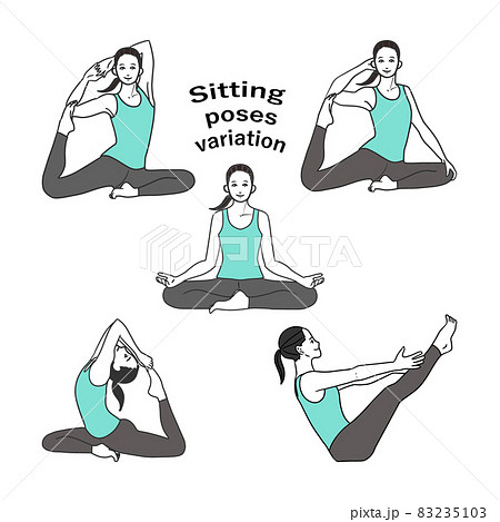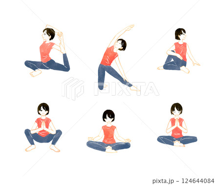 座って行うヨガのポーズのセット 若い女性の手描き水彩イラスト素材