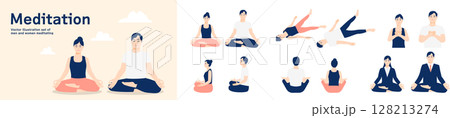 瞑想する男女のイラストセット(あぐら、シャバーサナ、深呼吸)