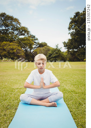 Boy child sitting cross-legged on light blue yoga mat outdoors meditating in grassy park