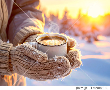 A person holding a ceramic mug filled with a hot beverage, with steam rising from