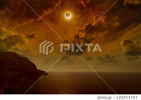 Total solar eclipse in dark red sky above sea and mountains
