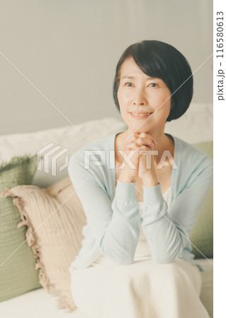 胸で両手を組み視線を落とす中年女性