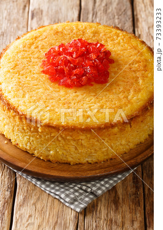 Tasty tahchin, a Persian dish of a baked rice, chicken, and yogurt colored by saffron closeup in the plate. Vertical
