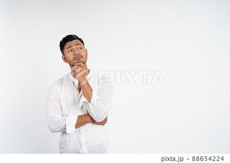 Pensive Hispanic Man Touching His Chin On Gray Background