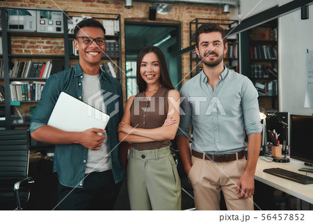 Happy to work together. Group of three cheerful young people in casual wear looking at camera with