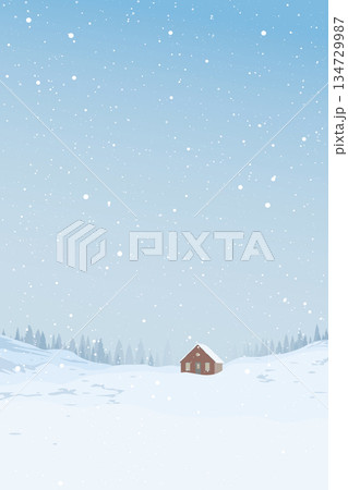 Winter landscape with lonely country house covered by white snow have silhouette pine forest and blue sky vertical background graphic illustration.