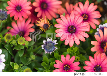 秋の陽ざしを浴びてカラフルに咲く満開のコスモス