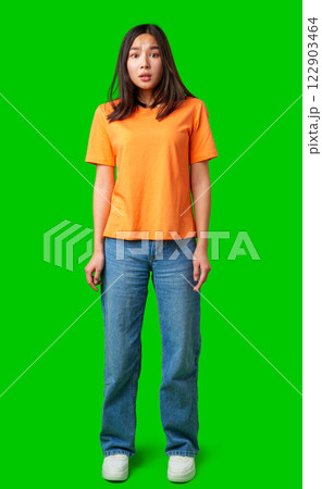 Young woman standing on green background wearing an orange shirt and blue jeans looking surprised