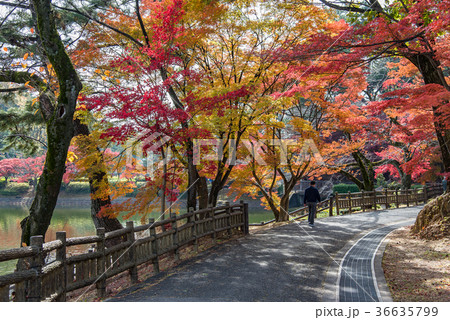 愛知 岡崎東公園の紅葉 あしのべ池のまわりを散歩する人