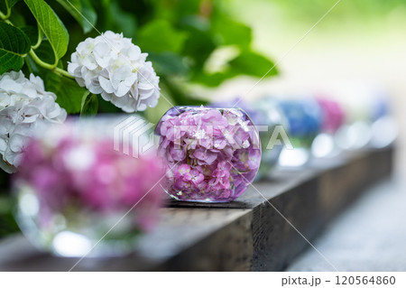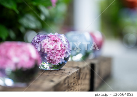 ガラスボールに入った紫陽花 縦列