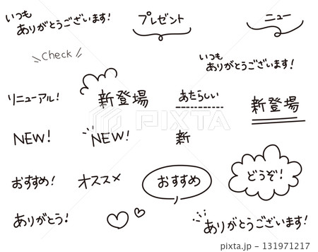 手描き文字の販促用メッセージセット ありがとう・おすすめ・NEW・新登場などのシンプルなあしらい