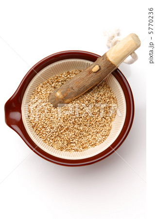 すり鉢と白ごま、すり胡麻。小さいサイズのすり鉢と擂粉木、白ごま(炒りごま)です。ゴマは擦っています。