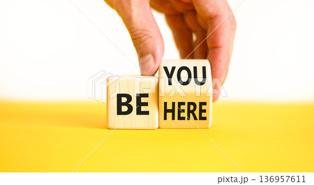 Be you and here symbol. Concept words Be here Be you on beautiful wooden block. Beautiful white background Businessman hand. Business motivational be you and here concept. Copy space.