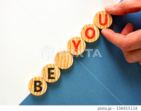 Be you support and help symbol. Concept word Be you on beautiful wooden circles. Beautiful blue and white background. Psychologist's hand. Business be you support and help concept. Copy space.