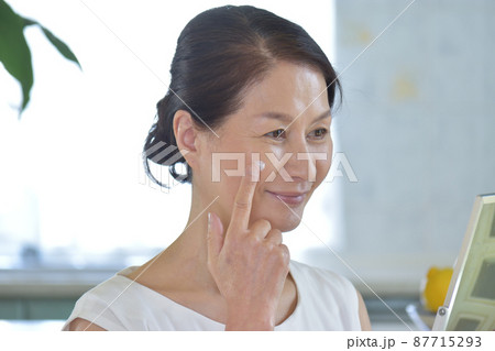 鏡をみながらクリームを塗りスキンケアをする60代女性